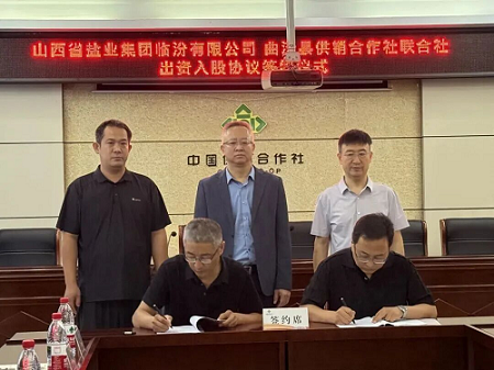 临汾盐业与曲沃县社等领导共同签订了出资入股协议,随后,刘金波、贾乔山等领导共同为“曲沃县晋盐惠民盐业有限公司”举行了揭牌仪式。